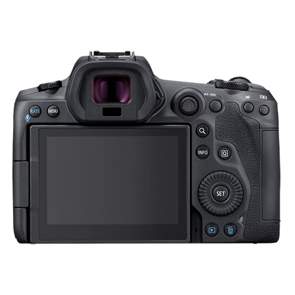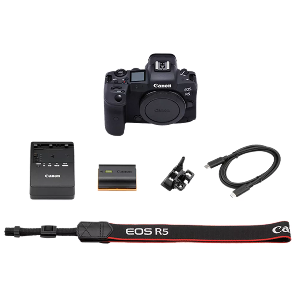 این دوربین حرفهای امتیازات تصویربرداری را تکمیل میکند. دوربین R5 دارای طراحی جدید و به روز است و برای کاربران سری 5 EOS هم آشنا است. منظره یاب الكترونیكی 0.5 اینچی و 5.76 میلیون نقطهای با وضوح بالا، نرخ رفرش 120 فریم بر ثانیه را فراهم میكند. در حالیكه صفحه نمایش السیدی لمسی 3.2 اینچی پشتی با زاویهای متغیر طراحی شدهاست تا به این گونه بتواند نیازهای تصویربردار را تأمین كند و با زاویههای زیاد و کم کار کند. یک السیدی با وضوح بالا باعث ایجاد یک گردش کار با کیفیت با 8S-II و همچنین دارای بلوتوث و اتصال بی سیم وای فای میباشد.